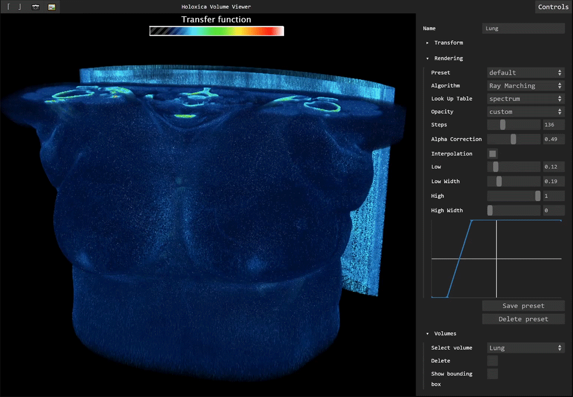HoloSlicer can be used to view medical data in both 2D and 3D, on a 2D screen and on a 3D display, with support for real time camera controls and manipulation of the volume rendering parameters. No glasses/headsets are required. The app accepts files in DICOM and NRRD formats and stores the volume data in a cloud database for ease of access across different machines in different locations. It allows users to interact with a volumetric object instead of a 2D data set which increases the spatial experience, understanding and learning. HoloSlicer is compatible with the Looking Glass Light Field 3D display for glasses-free 3D visualisation. For now it is an immersive educational tool for patient/medical education, not for diagnostic use. Below is a screenshot: